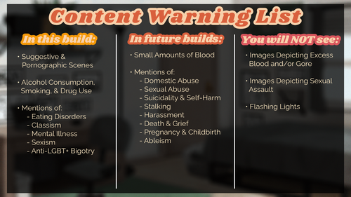 Probably for the best hat the Discord is for Patreons only. The VN contains a lot of themes/backgrounds that not everyone will be able to fully understand/be already familiar with. This could lead to misunderstandings over lack of understanding or understanding that here is a lack of understanding (Getting vehemently defensive over something small, instead of helping guide towards resources and information that can help explain things). This broad range inclusion of all these different types/personalities is what I want to applaud for. It helps bring in potential dynamics that can show how to and/or how not to deal/cope in a proper manner situations and people one may not be accustomed to being around. Positivity and friendliness brings acceptance and understanding and a desire to work things out, negativity and hostility can lead to running into walls. When people get along even if they don't agree on everything, things will go smoother, respect and be respected.